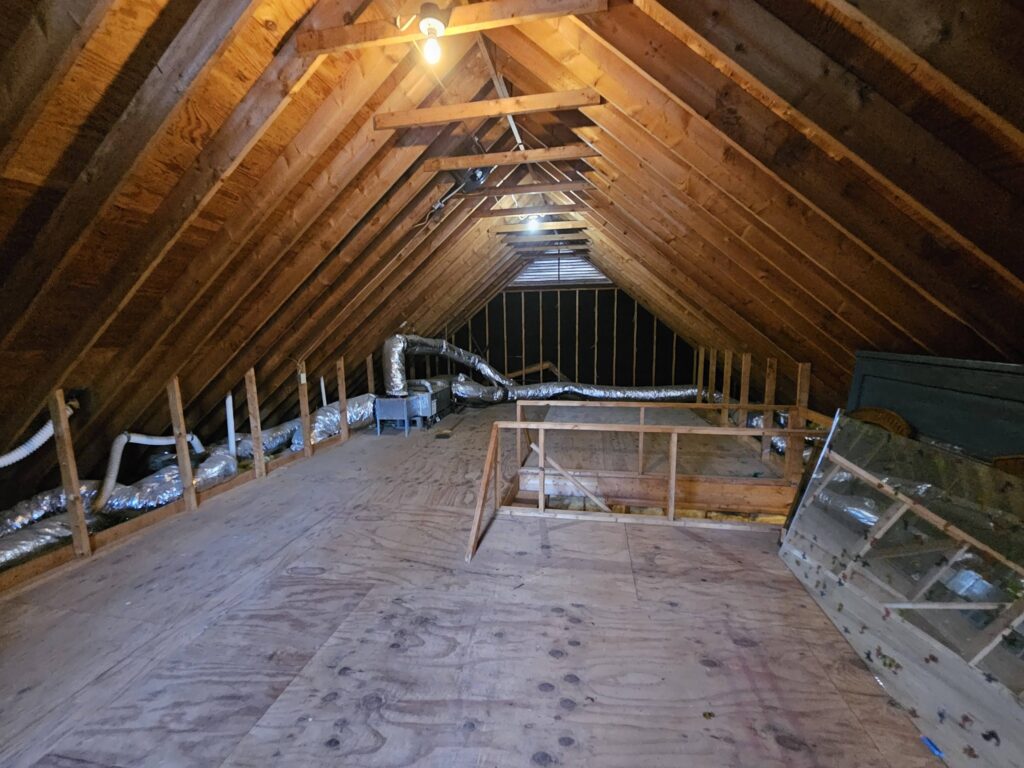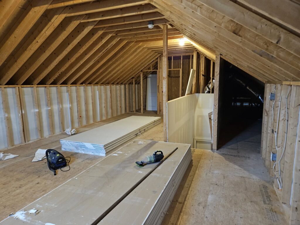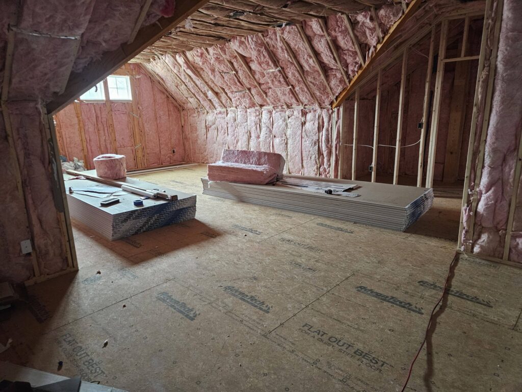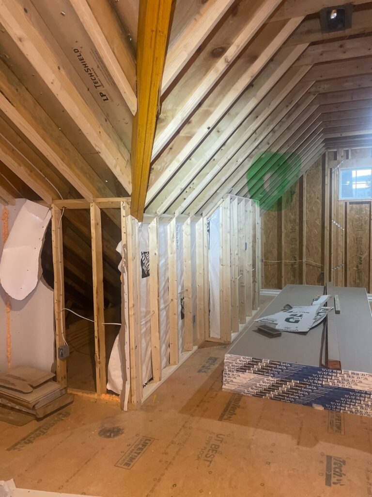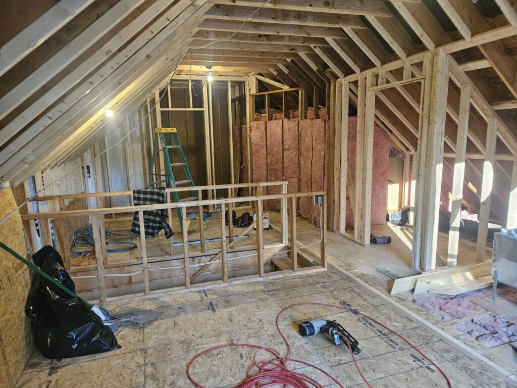 Before and after pics of finished 3rd floor attic. Full bath, media room, office, bedroom and finished storage area. Spring 2025.