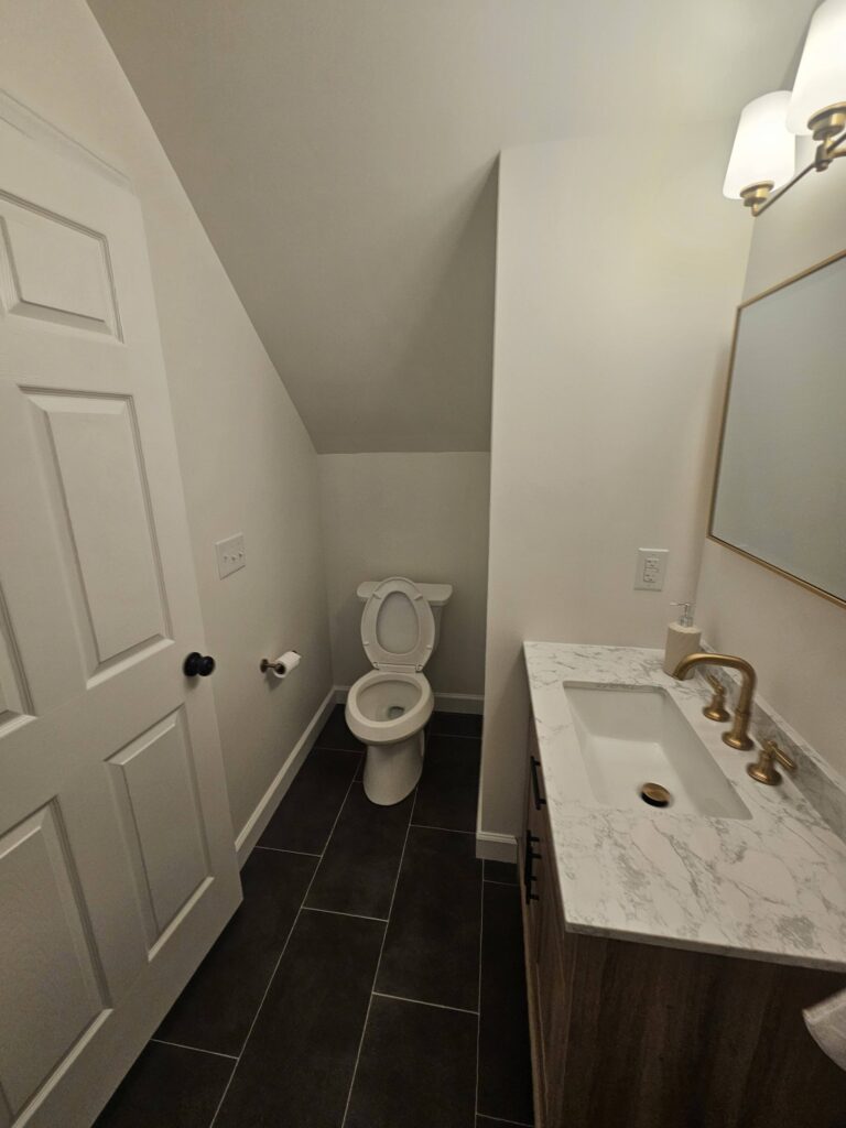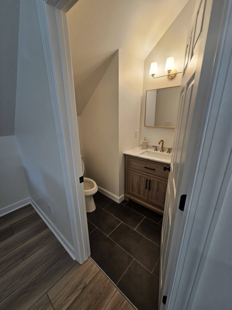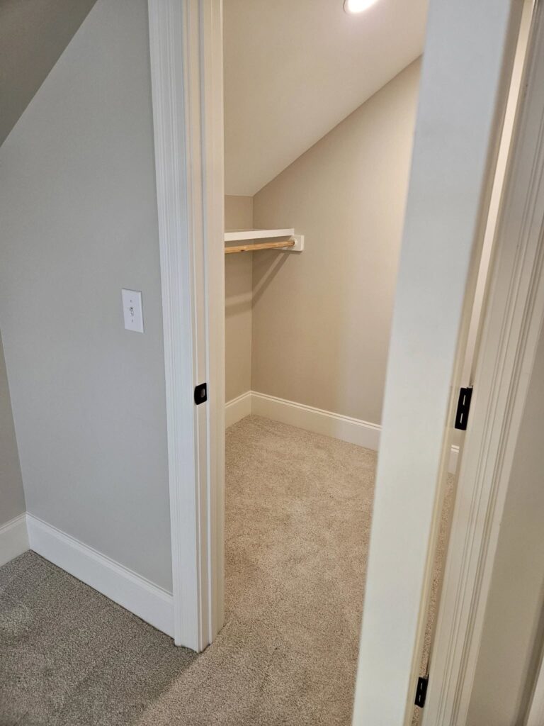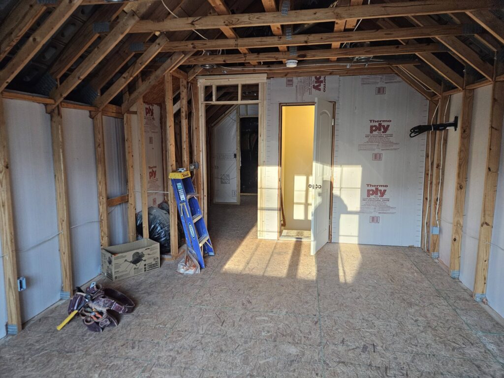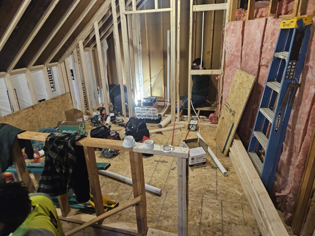 Before and after pics of finished 3rd floor attic. Full bath, media room, office, bedroom and finished storage area. Spring 2025.