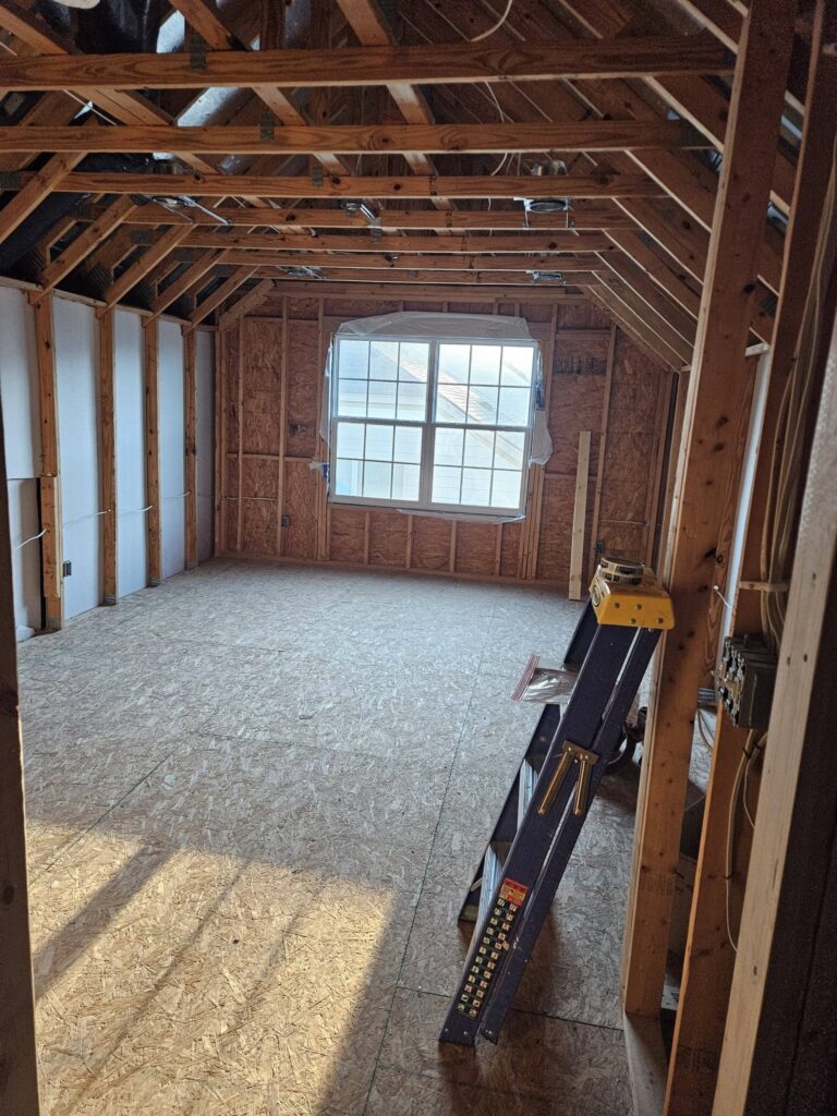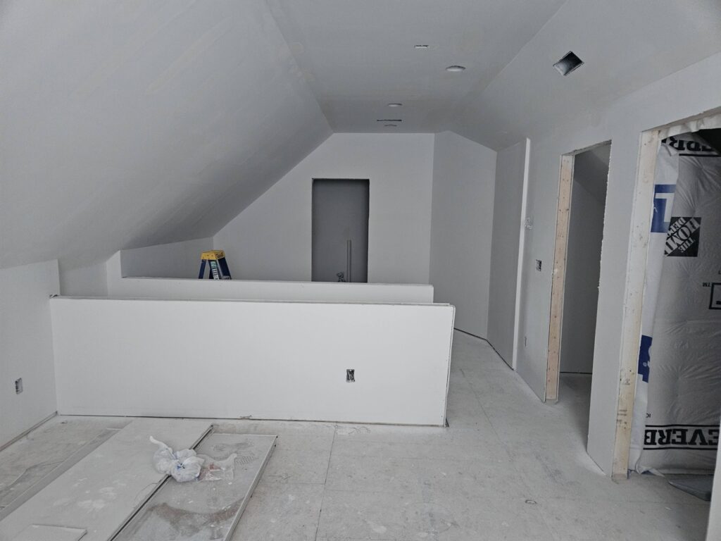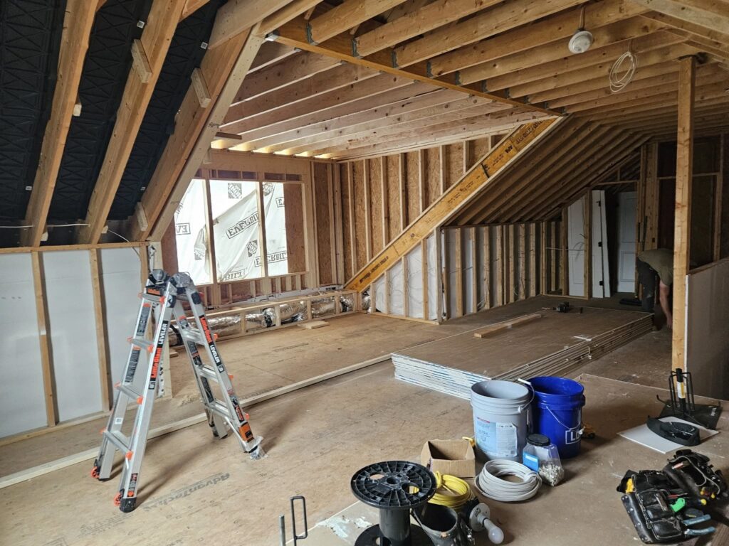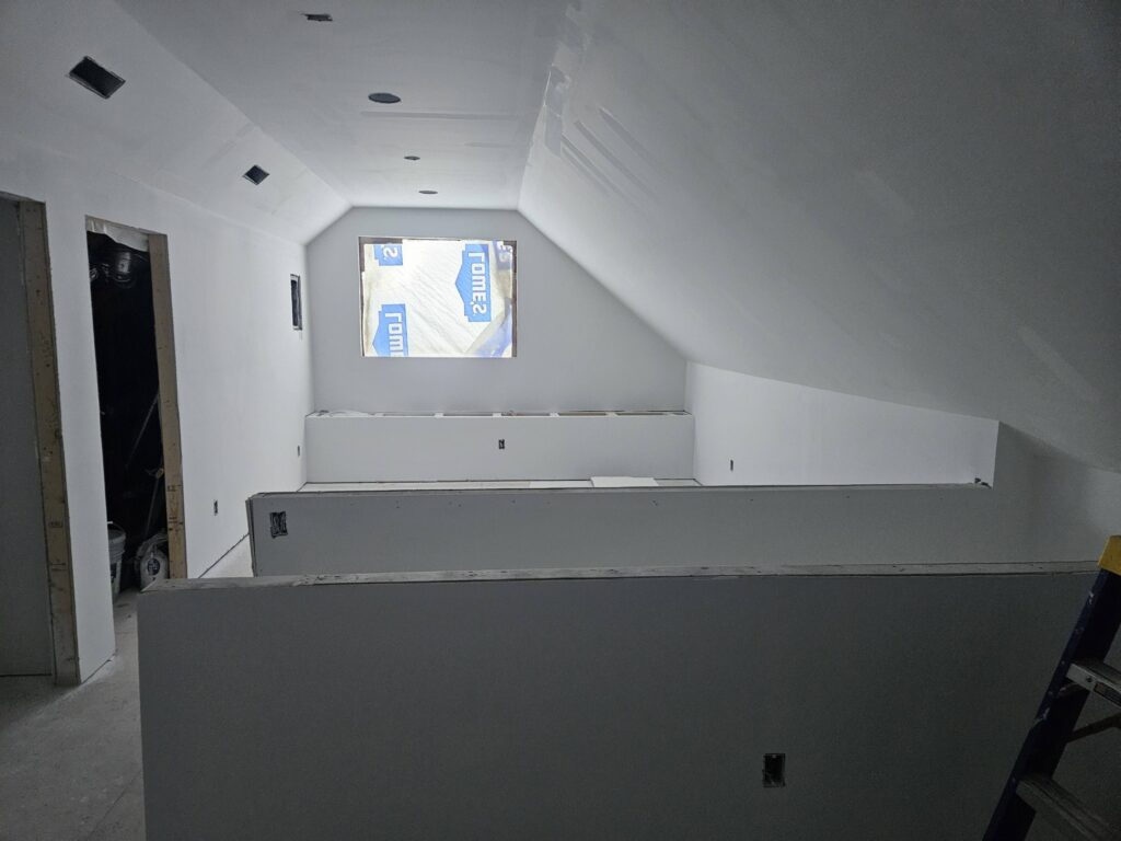 Before and after pics of an attic/3rd floor remodel in Abbington subdivision summer 2025. Added large dormer, bathroom, bedroom and media area.