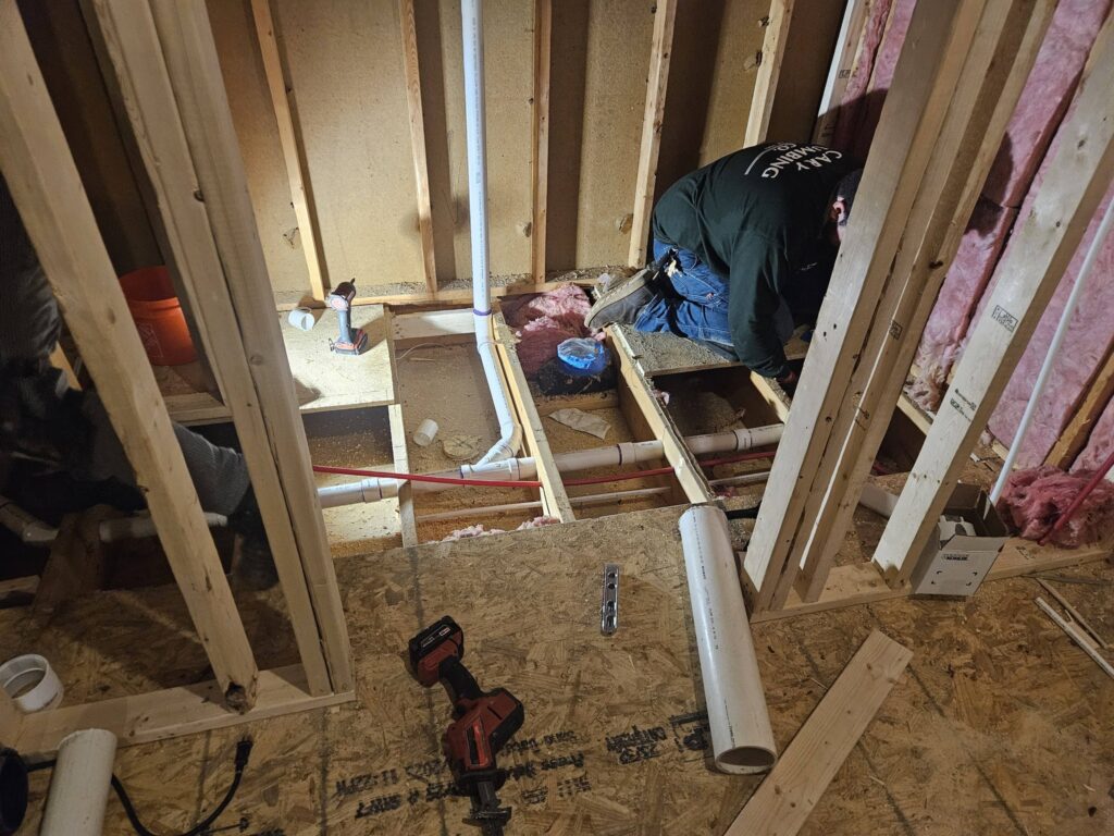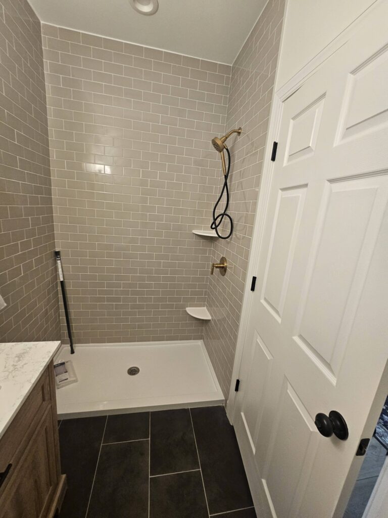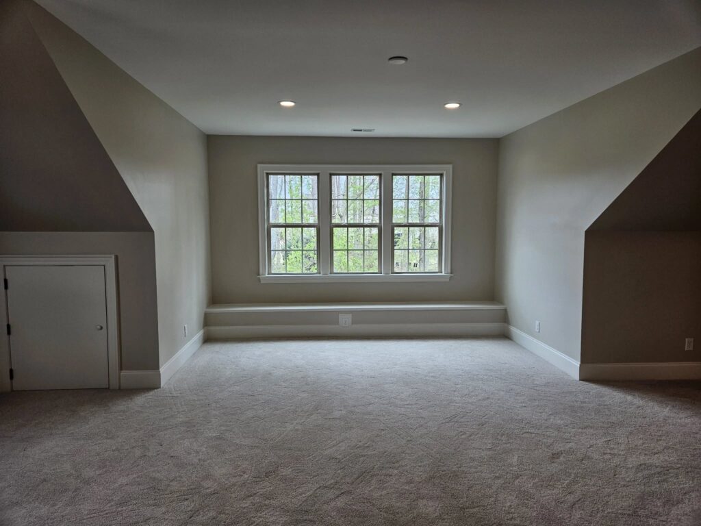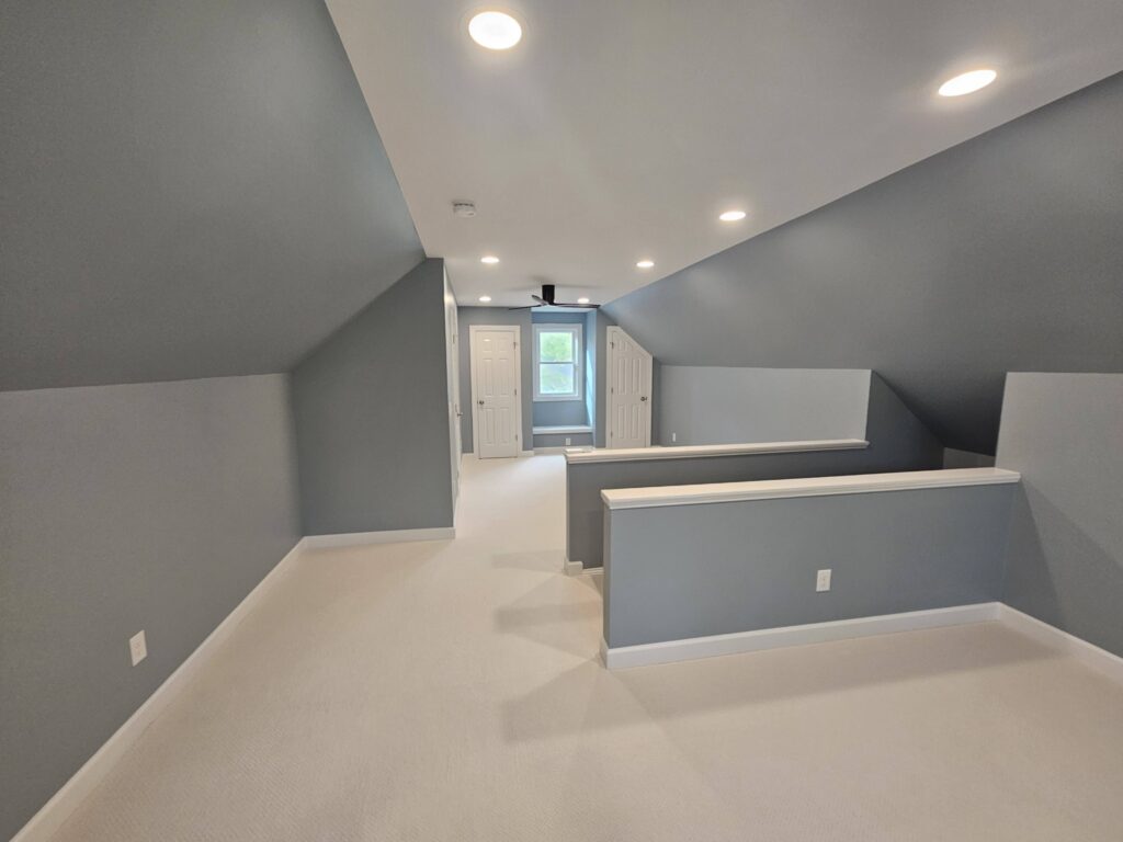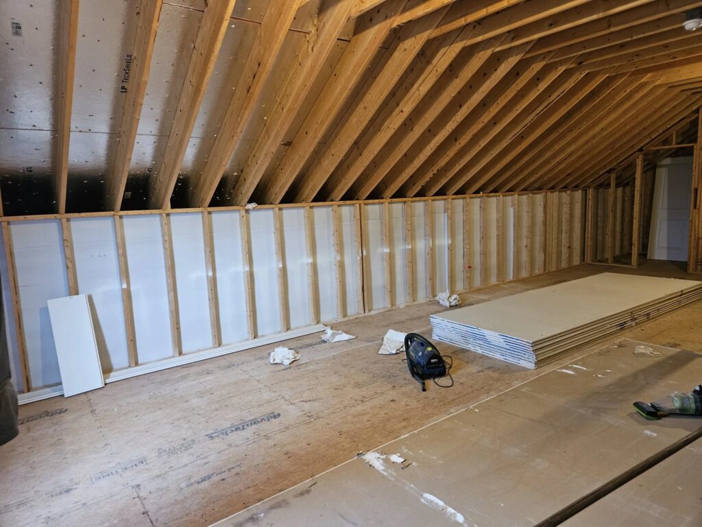 Before and after pics of an attic/3rd floor remodel in Abbington subdivision summer 2025. Added large dormer, bathroom, bedroom and media area.