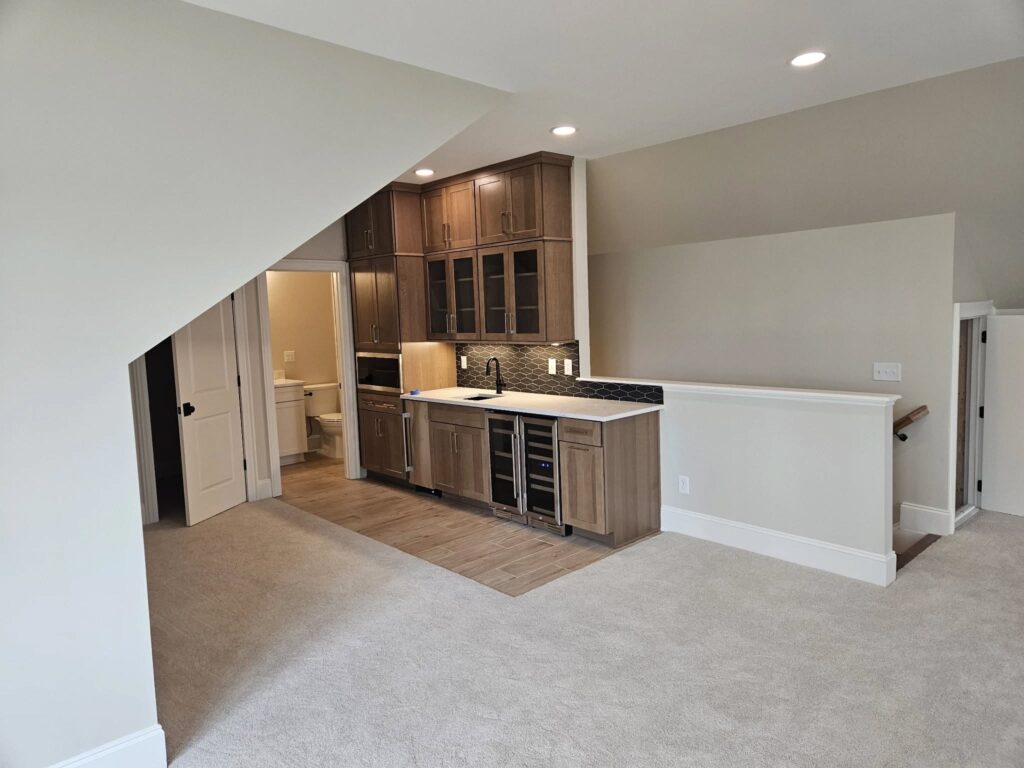 Added a bedroom, full bathroom and movie theater with stage seating and 120″ projector screen. Added dry bar and drink fridge.