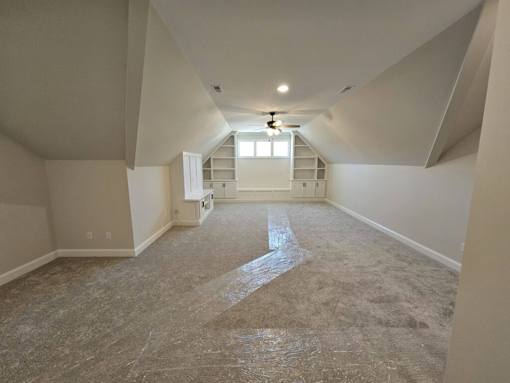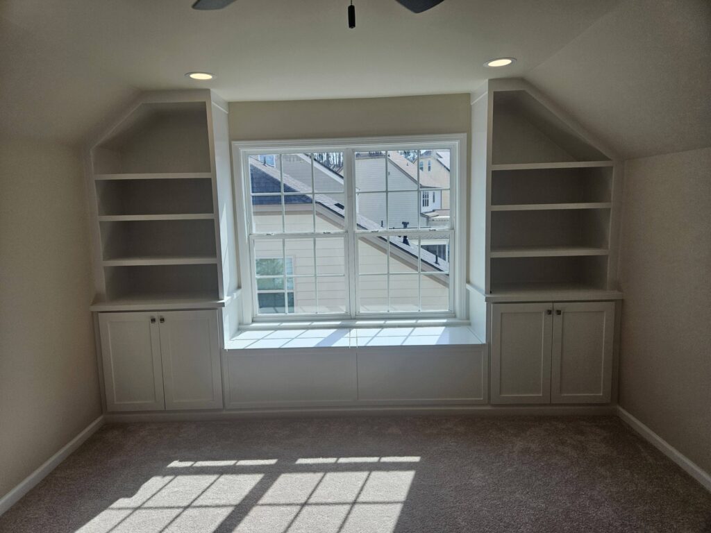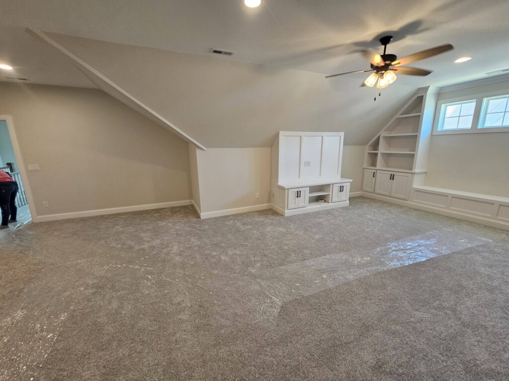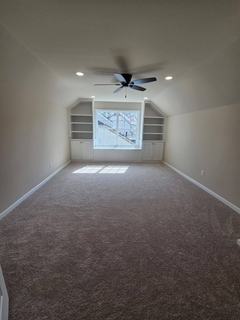 Before and after pics of new attic bonus room spring 2026 in Apex. Sonos surround, large storage closet, built ins and several other things they asked us to do before moving in.