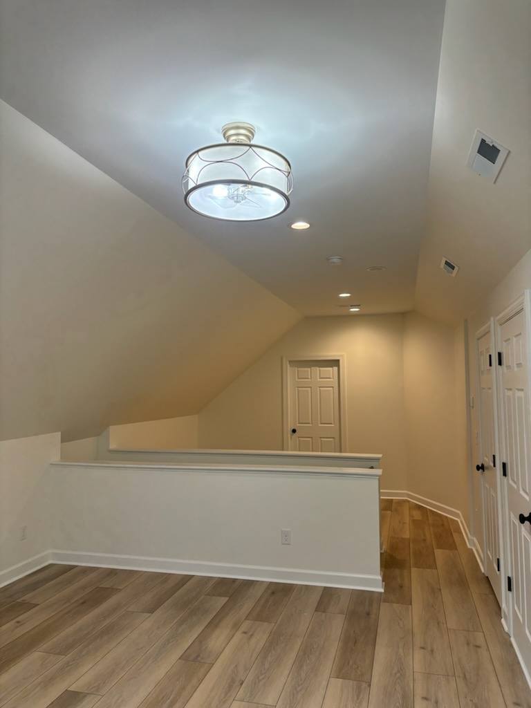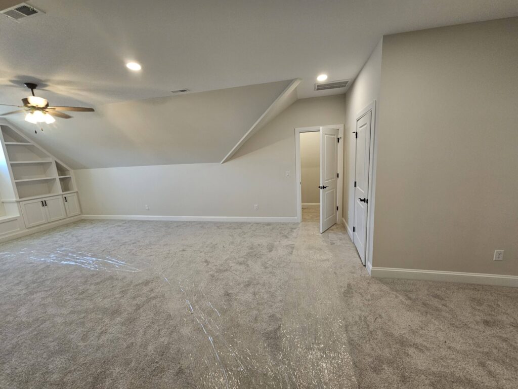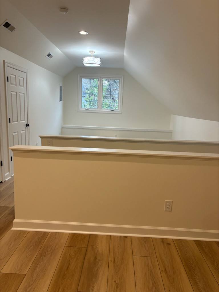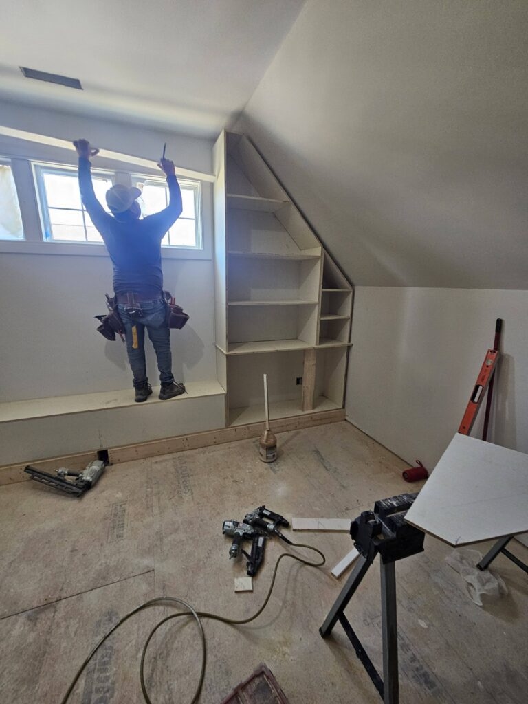 Before and after pics of new attic bonus room spring 2026 in Apex. Sonos surround, large storage closet, built ins and several other things they asked us to do before moving in.