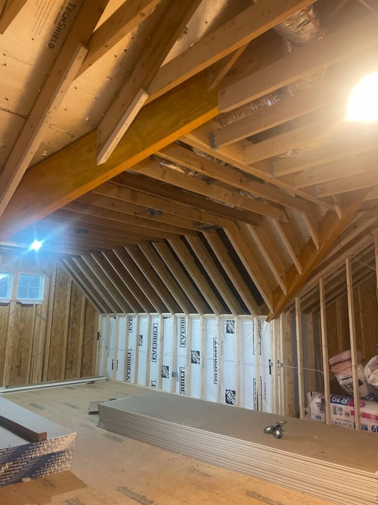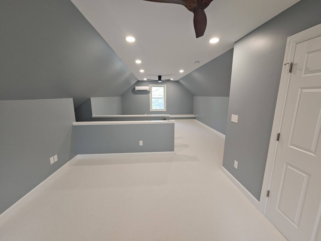 Another finished attic in Apex winter 2025. No frills, added two closets, two new windows, minisplit and lots of playroom for their kids. Carpet is high quality and quiet.