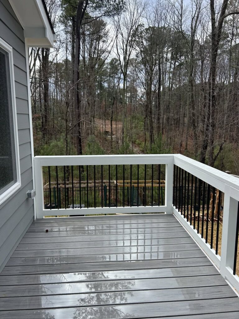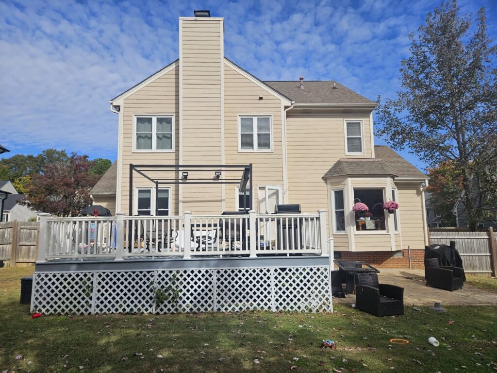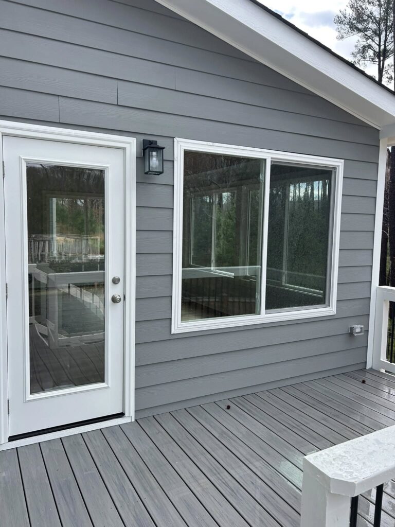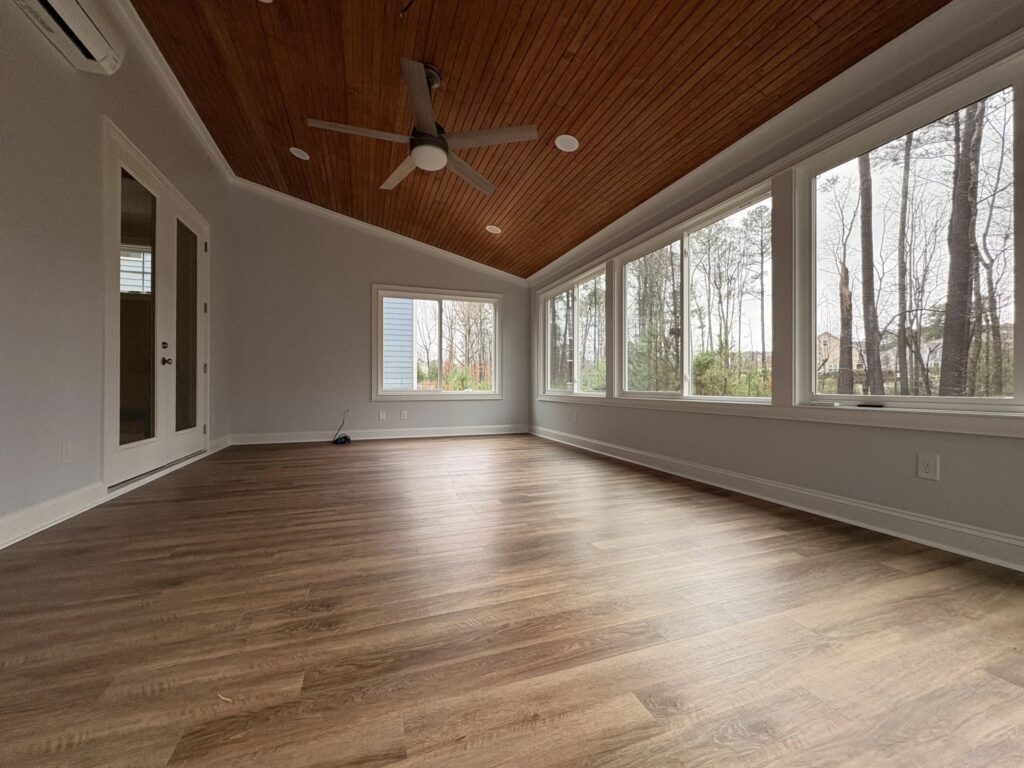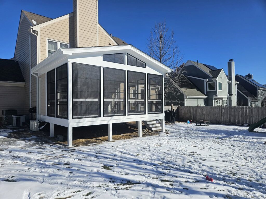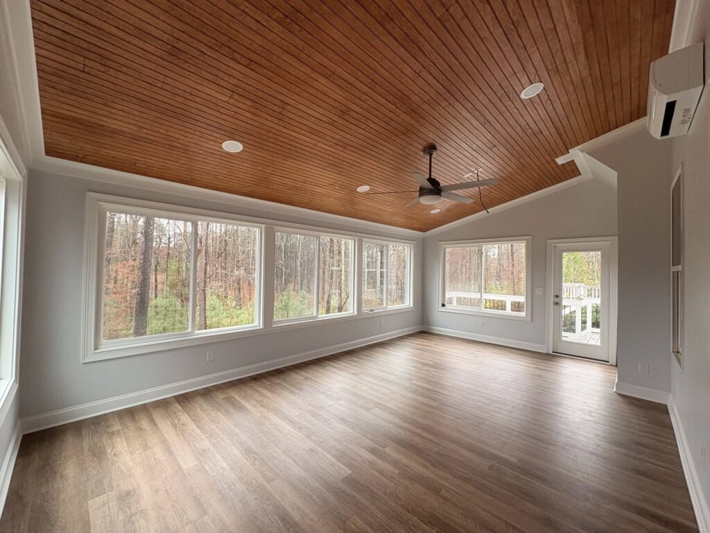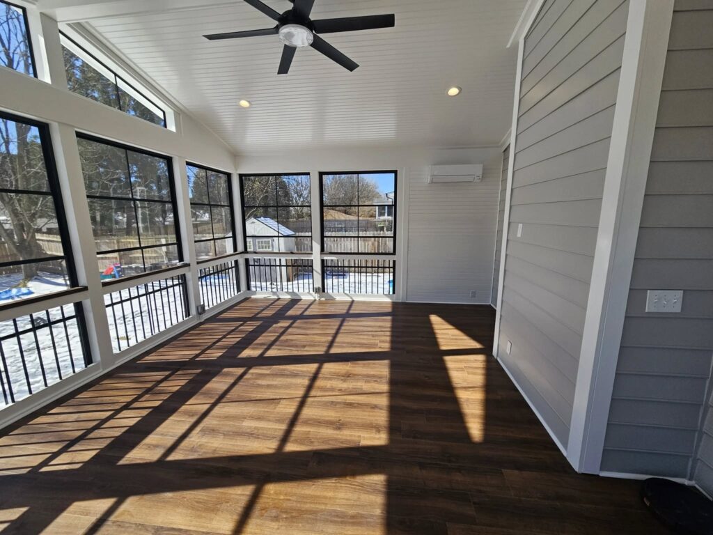 Another sunroom finished in Bella Casa. Before and after pics of 16′ x16′ gable roof with Trex side deck. Ductless floor mounted minisplit for ac/heat.
