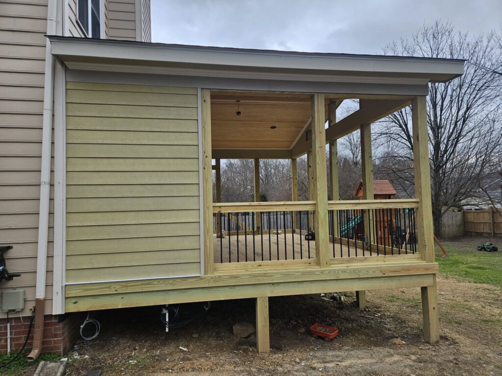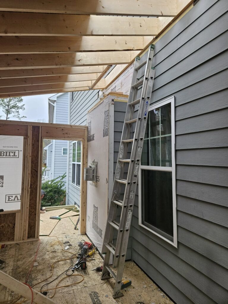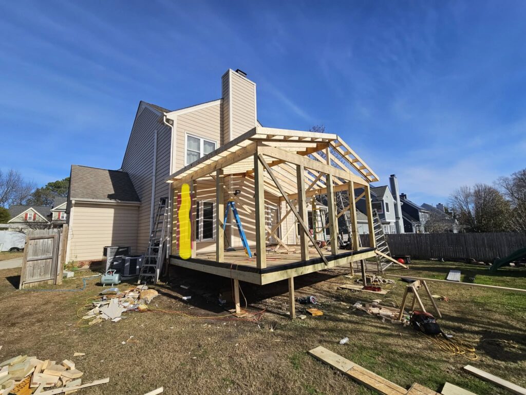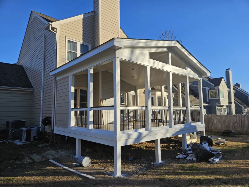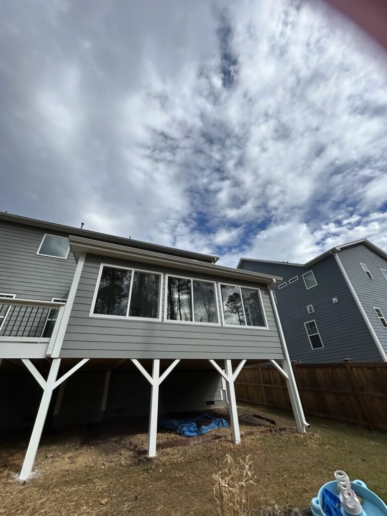 Before and after pics of a new sunroom with side deck. EZ breeze windows and ptac unit for heat and air.