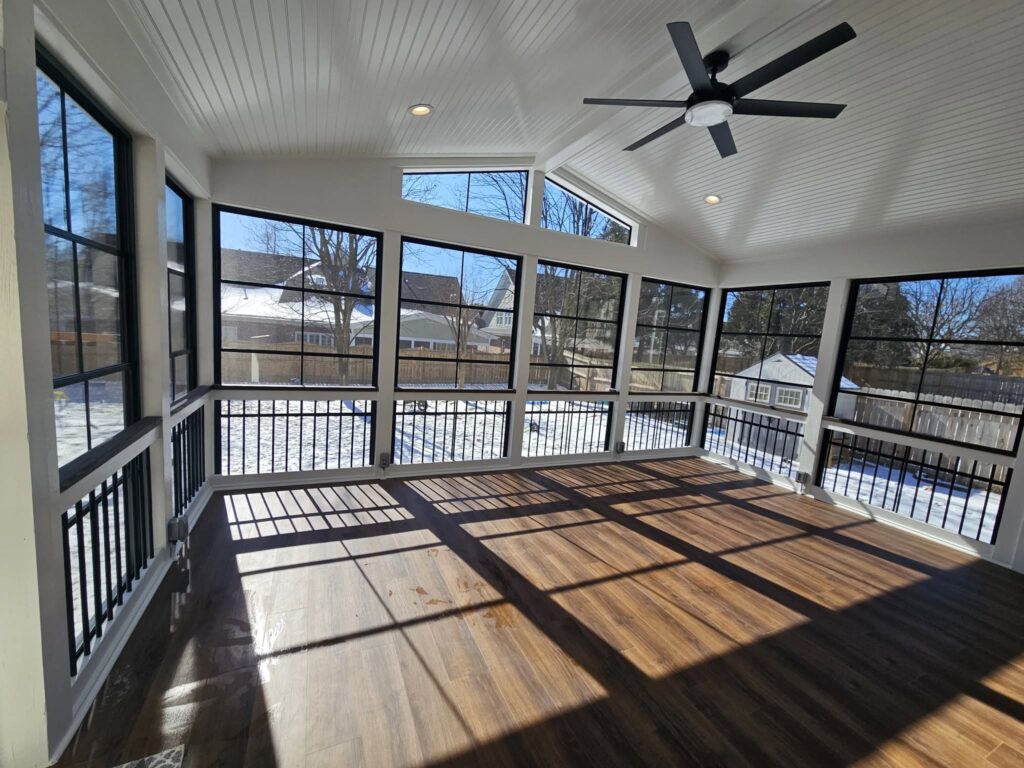 Before and after pics of a 16′ x 14′ EZ Breeze sunroom in Salem Village