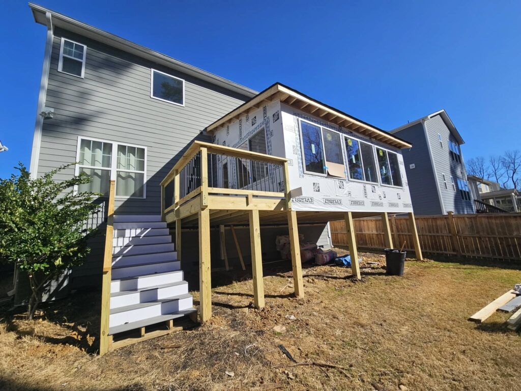 A sunroom addition in Bella Casa park side. Tile floor, outdoor shower with cedar panels, ipa floor. Trex decking and railings. Ductless heat and air. Move the slider to view the project before + after.